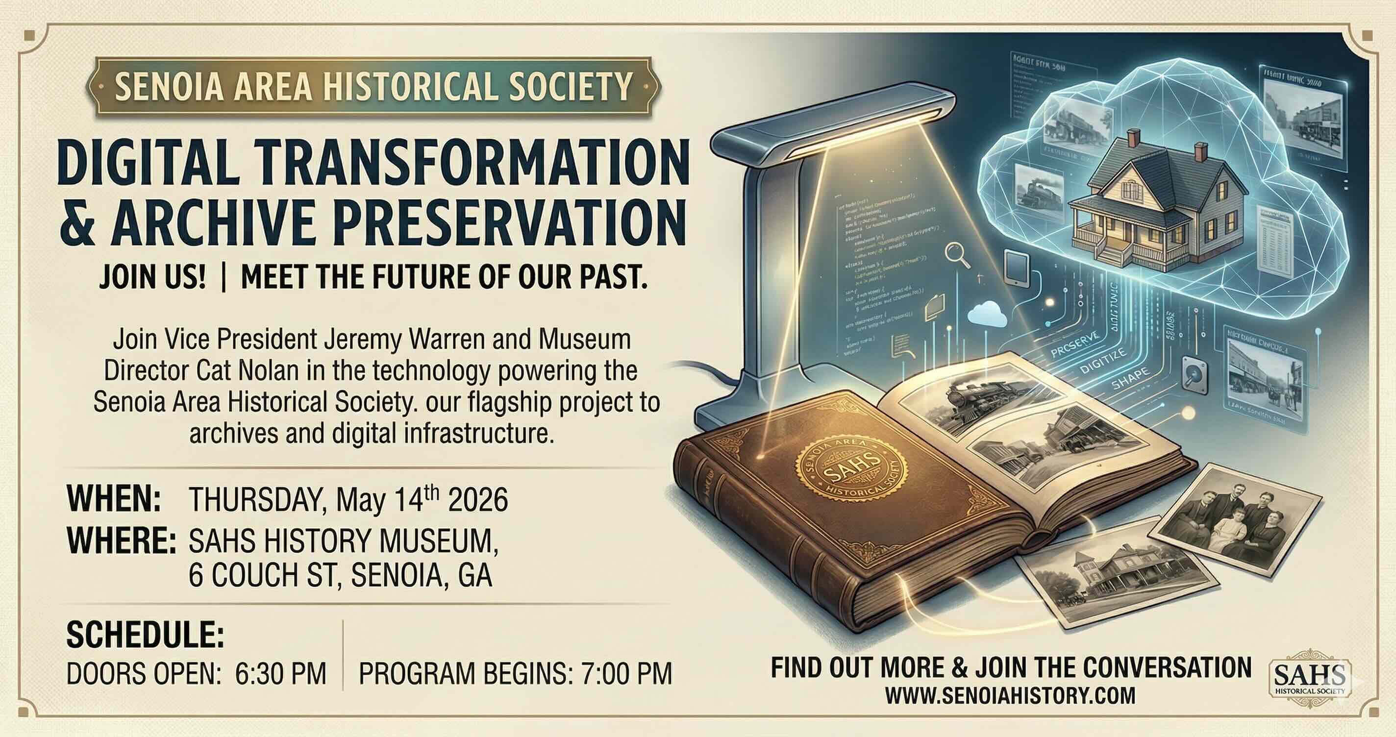 The Senoia Area Historical Society (SAHS) is a 501(c)(3) non-profit organization dedicated to preserving and promoting the social and cultural history of Senoia, Georgia, and its surrounding community.